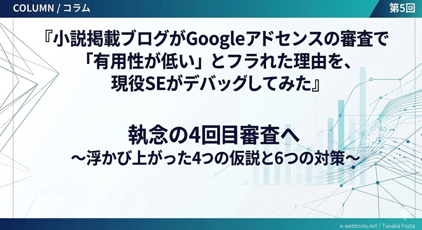 コラム:『小説掲載ブログがGoogleアドセンスの審査で「有用性が低い」とフラれた理由を、現役SEがデバッグしてみた』第5回:執念の4回目審査へ ~浮かび上がった4つの仮説と6つの対策~