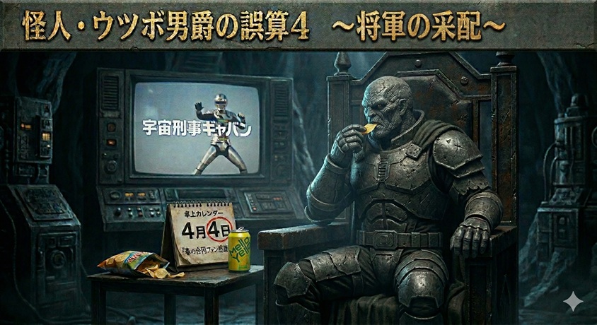 モニターに「宇宙刑事」の勇姿が映し出され、軽快な主題歌が玉座の間に響き渡る。将軍は備蓄しておいたポテトチップスを開封し、メローイエローのプルタブを引き抜いて、完全にリラックスした姿勢で画面に見入った。