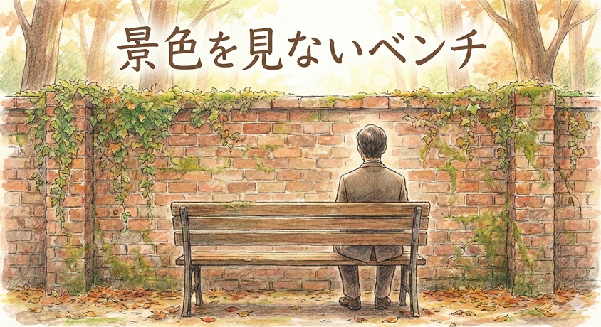 そのベンチは、美しい池でもなく、色鮮やかな花壇でもなく、ただの古いレンガの壁に向かってポツンと設置されていた。座っても、視界に入るのはツタが這う無機質な壁面だけ。背後には遊歩道があるため、道行く人に対して完全に背中を向ける形になる。