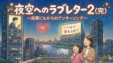 「あなた、お仕事お疲れ様」と、妻の穏やかで優しい声も重なりました。「今日はね、会場の中でも一番よく見える特等席を取れたの。ここからだと、あなたのビルもよく見えるわ」