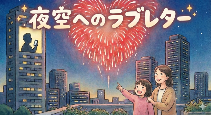 静かなオフィスの中、お父さんの心の中には、あの真っ赤なハートの花火のような、消えることのない温かい光がしっかりと灯っていたのでした。
