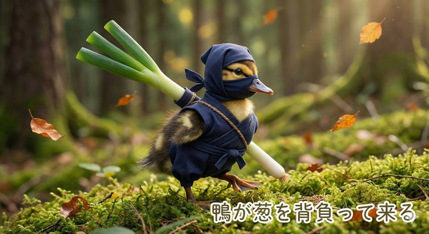 「わっはっは!こりゃあ驚いた!まさかことわざ通りの『鴨が葱を背負って来る』とは!しかもこんなに可愛い忍者姿で!」