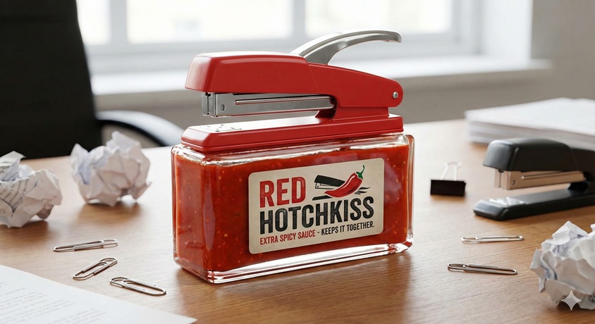 隣にあるのは、文房具のホッチキスを模した容器に入った**「レッド・ホッチキス」**。